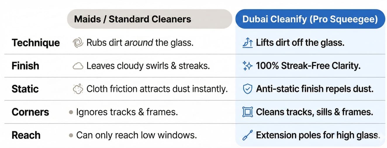 In Dubai, a great view is a luxury. Yet, from your morning coffee overlooking the Marina to your afternoon meetings in Business Bay, the desert wind is relentless. It constantly coats your glass in fine dust, turning your expensive view into a blurry haze. Sandstorms, humidity, and construction grime add to the problem, creating a stubborn barrier that blocks natural light and leaves your space looking gloomy.